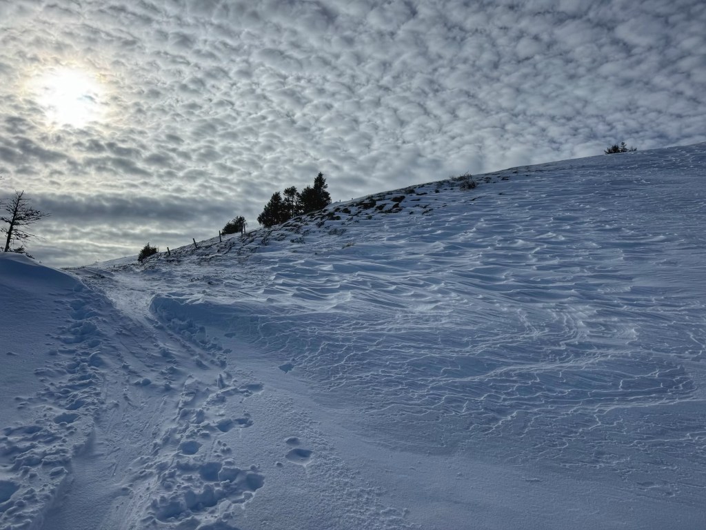 The views were stunning in all directions once we left the shelter of the trees. However, we were now battered by the strong and freezing wind that was scouring the snow on the top of the mountain. This had created wind slab in places and Sean explained this was why there was an avalanche warning for the area. Thankfully, there wasn’t enough snow for it to be too dangerous on our route.