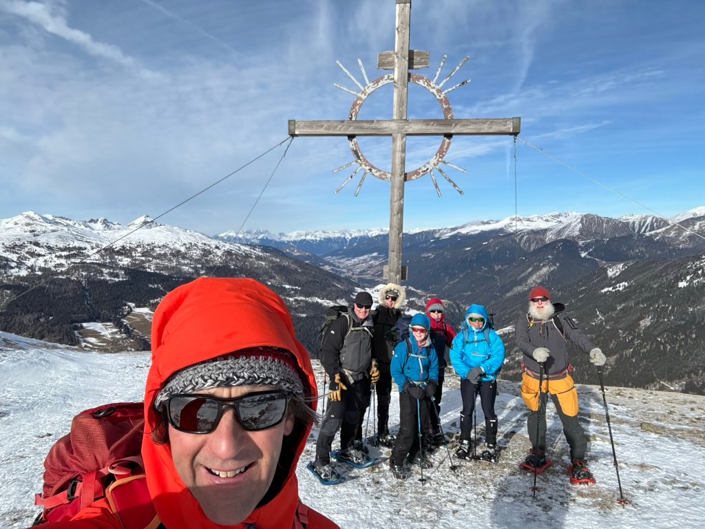 After a couple more hours, we reached the top of Sattelberg. I could barely stand in the wind and began to get very cold, so I didn’t end up standing with one foot in Austria and one in Italy as I’d planned. Instead, we dropped back down 10 metres to the summit cross where it was a bit more sheltered. We sang happy birthday to Pat (what a place to celebrate!) and took some photographs.
