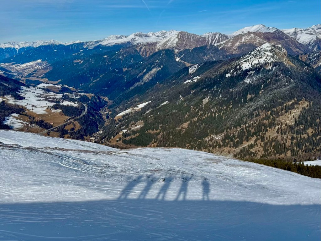 It was all downhill from the top now, quite steeply in places, so we each went at our own pace, some people (including me!) doing their best to protect aging knees. We alternated between swooshing down the ski slope in deep powdery snow and scraping over wind crusted and icy patches.