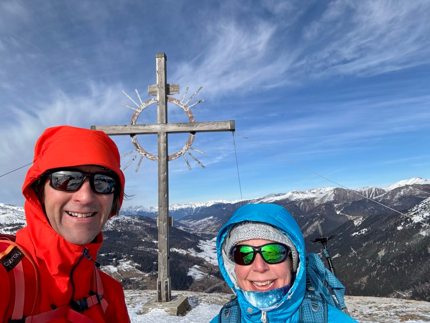 After a couple more hours, we reached the top of Sattelberg. I could barely stand in the wind and began to get very cold, so I didn’t end up standing with one foot in Austria and one in Italy as I’d planned. Instead, we dropped back down 10 metres to the summit cross where it was a bit more sheltered. We sang happy birthday to Pat (what a place to celebrate!) and took some photographs.