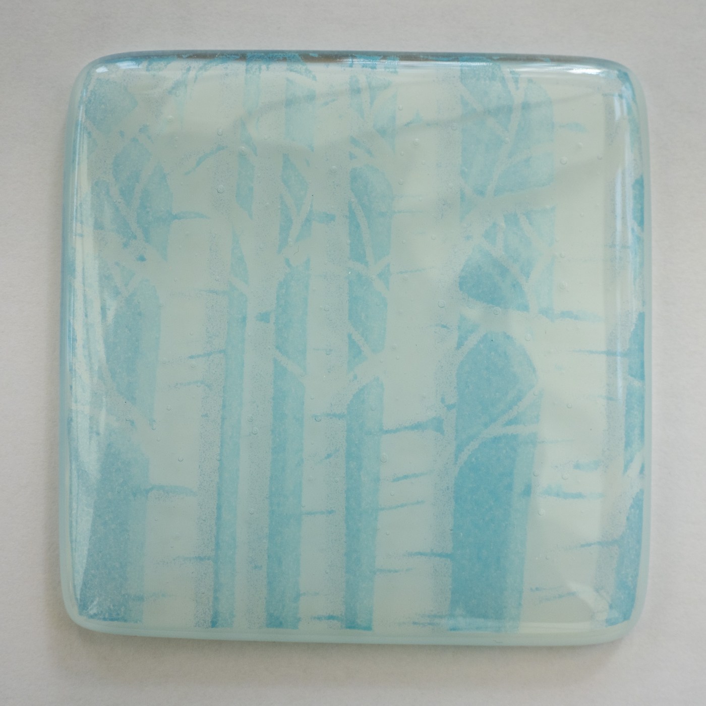 Last week I tried using stencils with powdered glass. Unfortunately, although I love the stencil of the trees, the powder I used was too pale and didn’t stand out after firing.