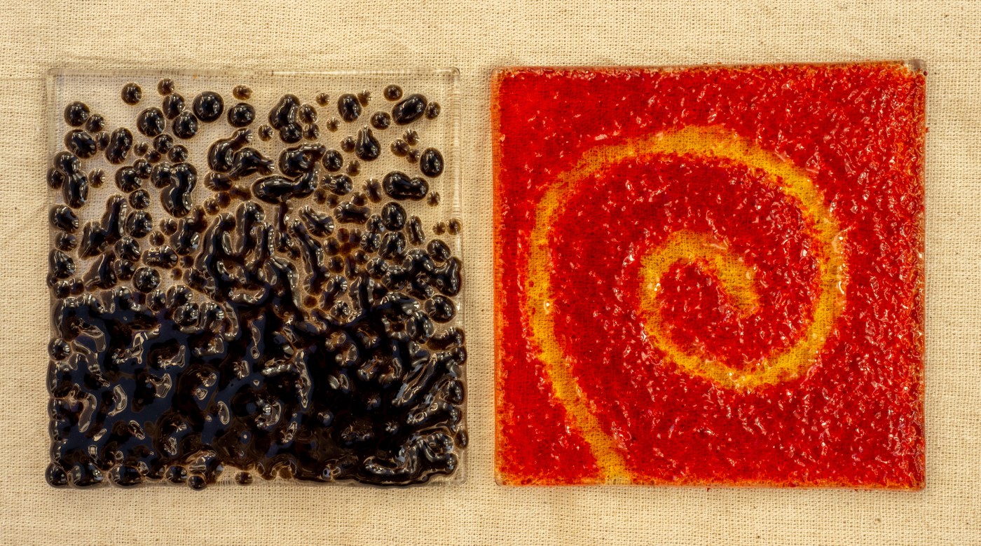 For these coasters I used different types of frit, which is tiny coloured pieces of glass. On the left, I used coarse frit and simply spread it upwards from the bottom of a clear coaster, becoming less dense nearer the top. On the right, I used medium frit and sprinkled it all over the base, before making a swirl in the red and sprinkling some amber frit into it.